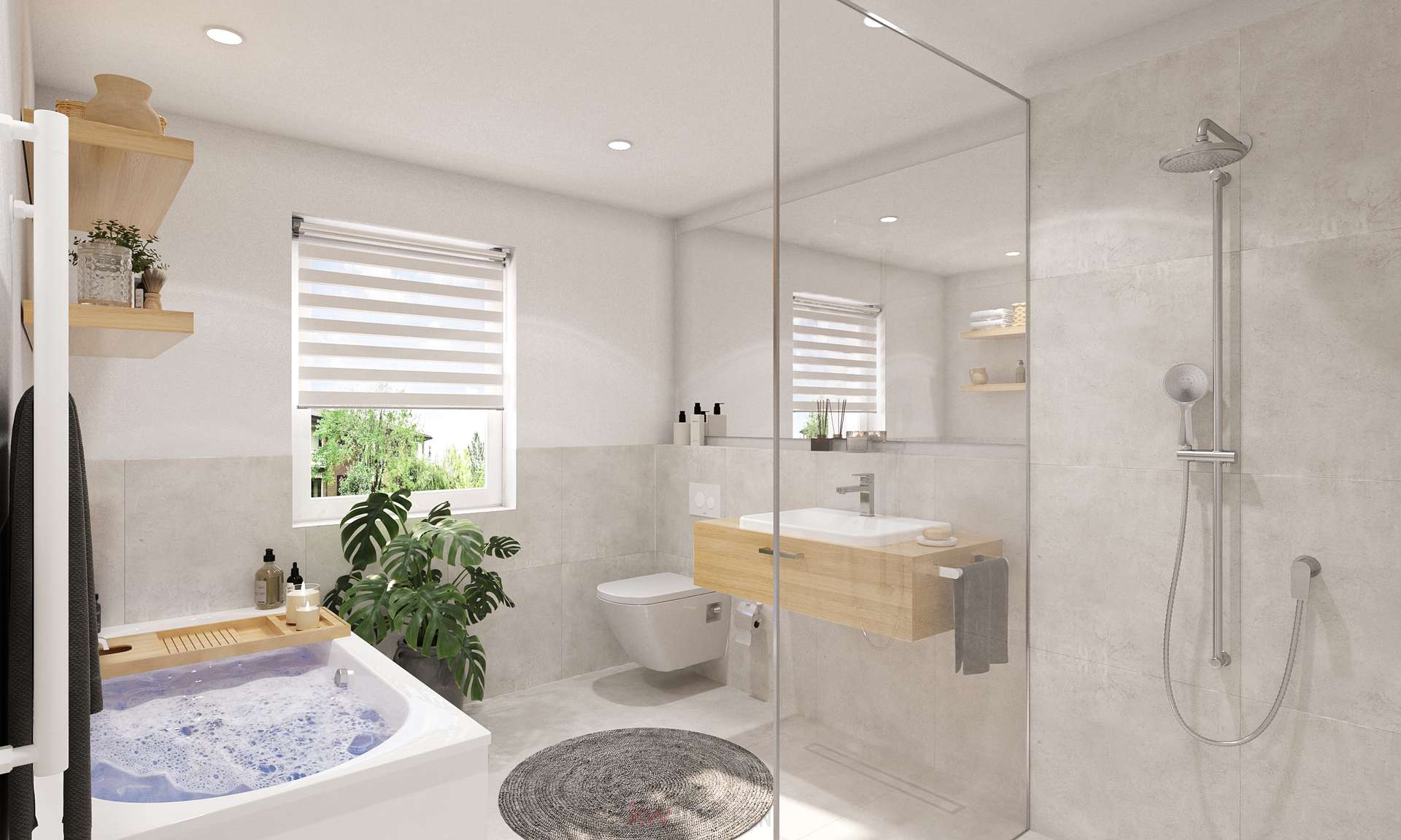 Im ersten Stock befinden sich neben 2 Kinderzimmern auch ein praktisches großes Homeoffice-Zimmer und natürlich ein tolles Tageslichtbad mit Luxus-Badewanne und bodentiefer Dusche.